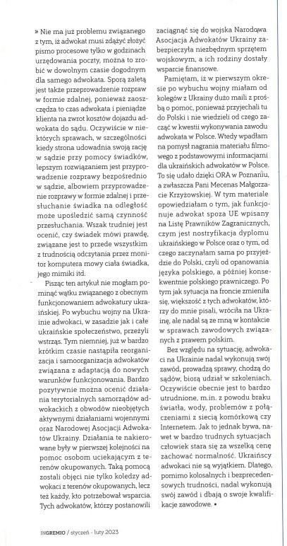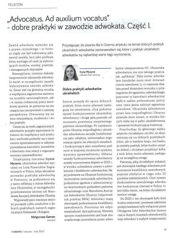 Моя стаття для польського професійного журналу (адвокатури в м. Щецин) In Gremio на тему добрих практик адвокатів в Україні. iryna 9 Лютого, 2023 0 коментарів Запрошую до ознайомлення з моєю статтею для польського професійного журналу (адвокатури в м. Щецин) In Gremio на тему добрих практик адвокатів в Україні. Поделитесь этой статьей: Навігація записів Попередній Попередній запис: Пригоди поляків в Україні, або як отримати аліменти від громадянина Польщі на дітей, які проживають в Україні? (Частина 2)Далі Наступний запис: Пригоди поляків в Україні, або як поділити майно яке є спільною сумісною власністю польсько-українського подружжя? (Частина 3) Залишити відповідь Скасувати відповідьВаша e-mail адреса не оприлюднюватиметься. Обов’язкові поля позначені *Коментар * Ім'я Email